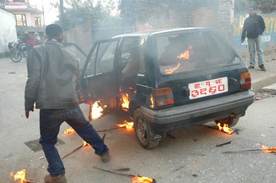 Look at kantipur news of today, it has complete video of this act... these bandars destroy it then, flip over the car.. they also tried to destroy another car but the other driver sped away faster than they could react.... Sale pashupati ka bandar haru... they do not know difference between vandalism and protest.. Check nepali news it is somewhere around 20 minutes point. - http://kantipuronline.com/ktv_news.php