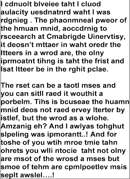 ALZHEIMERS' EYE TEST Count every "F " in the following text: FINISHED FILES ARE THE RE SULT OF YEARS OF SCIENTI FIC STUDY COMBINED WITH THE EXPERIENCE OF YEARS... (SEE BELOW) HOW MANY ? WRONG, THERE ARE 6 -- no joke. READ IT AGAIN ! Really, go Back and Try to find the 6 F's before you scroll down. The reasoning behind is further down. The brain cannot process "OF". Incredible or what? Go back and look again!! Anyone who counts all 6 "F's" on the first go is a genius. Three is normal, four is quite rare.