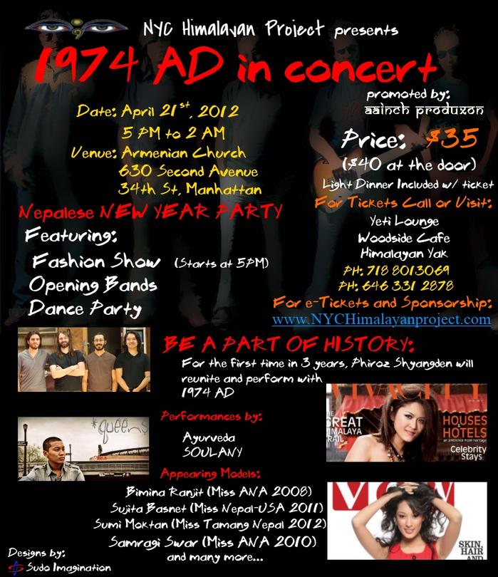 Please join us in celebrating Nepalese New Years in New York City with Nepal's foremost band, 1974AD! Slated to be a one of a kind mega event with acts such as a Fashion Show displaying the talents of young Nepalese/Tibetan designers in the US (Models: Miss ANA 2008 - Bimina Ranjit, Miss Nepal USA 2011 - Sujita Basnet, Miss ANA 2010 - Samragi Swar, Miss Tamang Nepal 2012 - Sumi Moktan and many more), an opening band consisting of AYURVEDA, the most prominent Himalayan Band in the Diaspora and NYC's own Himalayan Rapper, SOULANY.