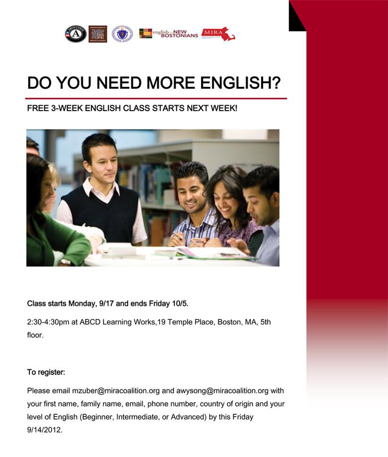 Each afternoon, 20 AmeriCorps members will be practice-teaching with professional trainers from World Learning/School of International Training. Please share this opportunity with your clients and community - it's a great chance to take a quick intensive English course. We are looking for a three-week commitment by the learners to keep a consistent group.