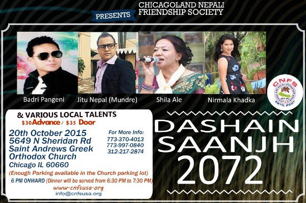 We are very glad to announce that CNFS is organizing Dashain Saanjh 2072 on October 20 , 2015, to preserve Nepali Culture and tradition and get together all of us around Chicagoland. We are featuring popular folk singer Badri Pangeni, Shila Ale and comedian Jitu Nepal (Mundre), Nirmala Khadka from Nepal along with other local talents performing in the event.