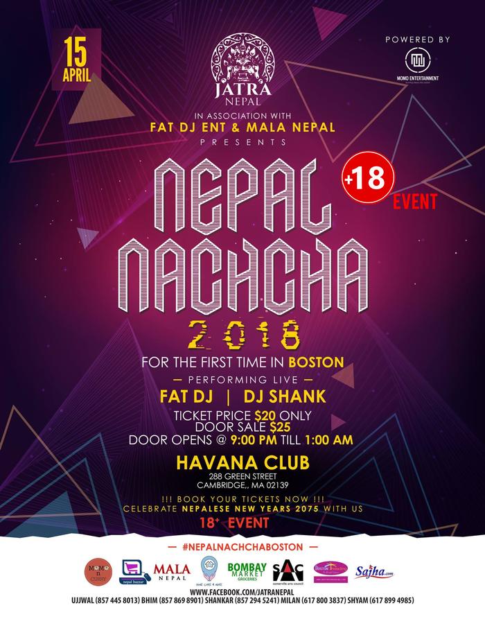 "Nepal Nachcha is a globally celebrated event on the occasion of NEPALI NEW YEAR and we are bringing this global festivity to Boston for the first time. It will be a night of endless dances, groovy beats and the most memorable way to celebrate our calendar, our New Year. This will most certainly be the most happening event of the night, and we have a line-up of DJs to have you swaying and moving the entire night.So come celebrate this night with us:NEPAL NACHCHA, hami Nepali pani sangai nachaum!"