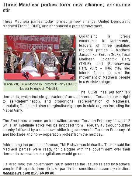 KATHMANDU, Feb 10 - Though the government has renewed its call for talks to the agitating Madhesi parties addressing some of their demands, leader of the newly-formed United Madhesi Democratic Front (UMDF), Mahantha Thakur Sunday made it clear that their proposed agitation will continue and that they will not compromise with any of their demands. The three major parties in Terai-- Sadbhavana Party led by Rajendra Mahato, Madhesi People’s Rights Forum led by Upendra Yadav and newly-formed Terai-Madhes Democratic Party led by Thakur-- announced the formation of the new front, UMDF, yesterday putting forth a fresh six-point demand that includes an autonomous Madhes state with the right to self-determination, and a provision that allows the parties which field candidates for less than 50 percent of the total CA members, not to make their lists for proportional representation inclusive. The new Madhesi front also demanded proportional representation for Madhesis, ethnic and indigenous groups, dalits, women and other marginalized communities in all state organs including the police, army and civil service. While a cabinet meting today decided to make all state organs inclusive, ensuring proportional representation for Madhesis and all other marginalized groups and communities, the government is yet to respond to the other UMDF demands. Thakur claimed that their key demands-- an autonomous Madhes state with the right to self-determination-- is yet to be addressed by the government. “Our agitation won’t be called off,” he said, “Until all our demands are met.” Saying that the government was unilaterally misinforming about the talks, he added that the Terai-Madhes people want a common Nepal, common welfare, and identity. He further claimed that the Terai people were not even ready to listen to the word ‘election’ without their demands met. “The condition of Madhes is such that the people are not even ready to listen to the word election,” he claimed, adding, “We are not ready for the fulfillment of our demands in installments.”  “All the demands can be addressed now,” he said, “If the government is determined and ready to resolve the national problem in peaceful manner, then I don’t think there is any demand that cannot be met.” If their demands are not fulfilled, the UMDF has warned to launch indefinite general strike from February 13 and blockade of the Kathmandu Valley and non-cooperation to the government in the southern plains from February 17. The other key demand includes a status of martyrs to the 45 persons killed in the course of the Madhes movement last year, and adequate compensation and free medical treatment to those injured and/or physically disabled in the course of the agitation.